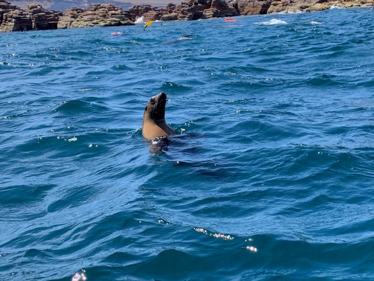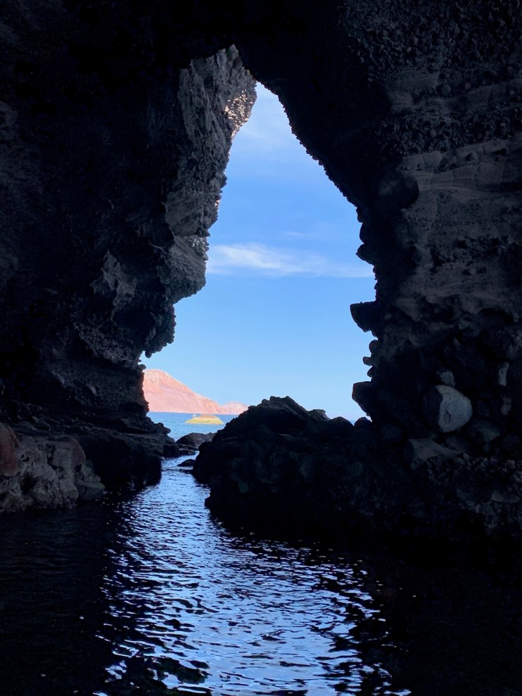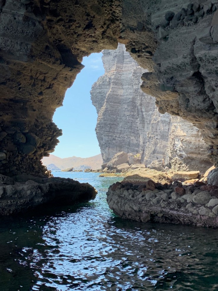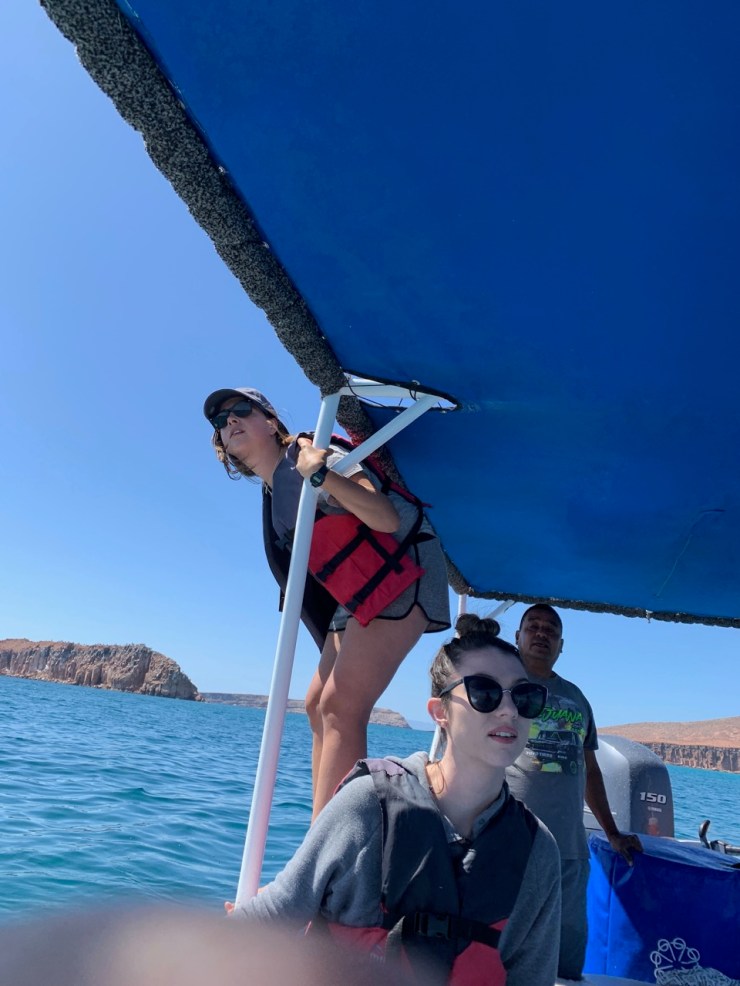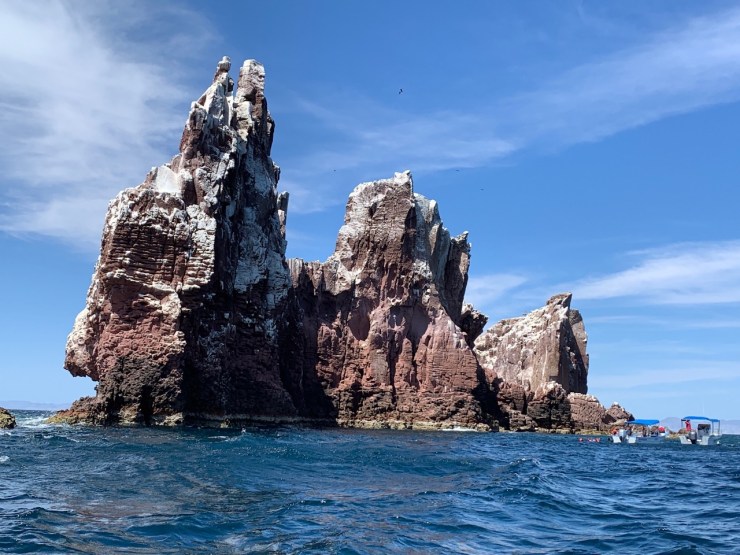 We crashed our way through the waves up to Los Isolates, a sea lion colony at the tip of Espiritu Santos, where 300 sea lion families hang out. Here you can don your wet suit and snorkel mask to swim with these animals. The waves were too much, so rather than be smashed into the rocks, our small group of 4 opted to stay in the panga and watch a few determined snorkelers from the other boats. The sea lions are curious, and will pull on your flippers, zippers and masks.