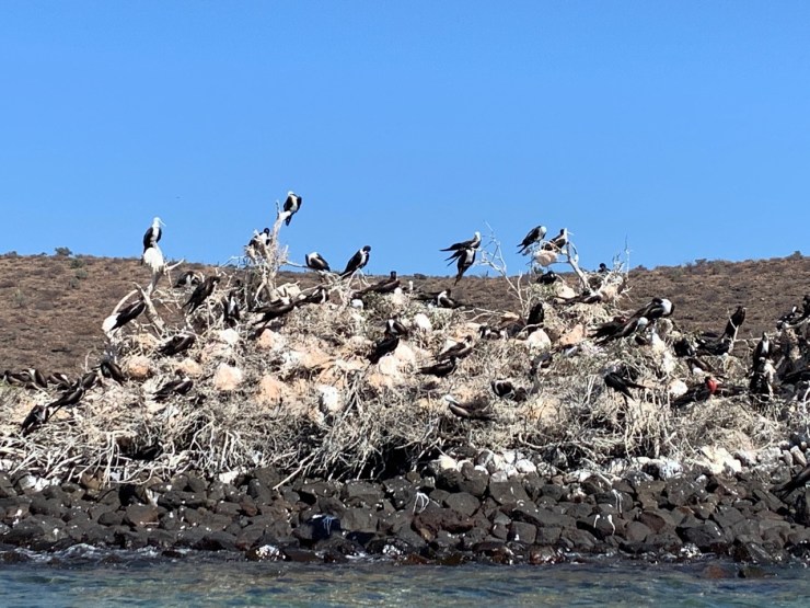We were on the lookout for the blue footed booby along the cliffs, but instead found a nesting area for frigate birds that had taken over a 100-year-old pearl farm. These are large soaring seabirds with a forked tail, who spear fish – but can never get wet in the sea, or they will drown. (I know how they feel.)