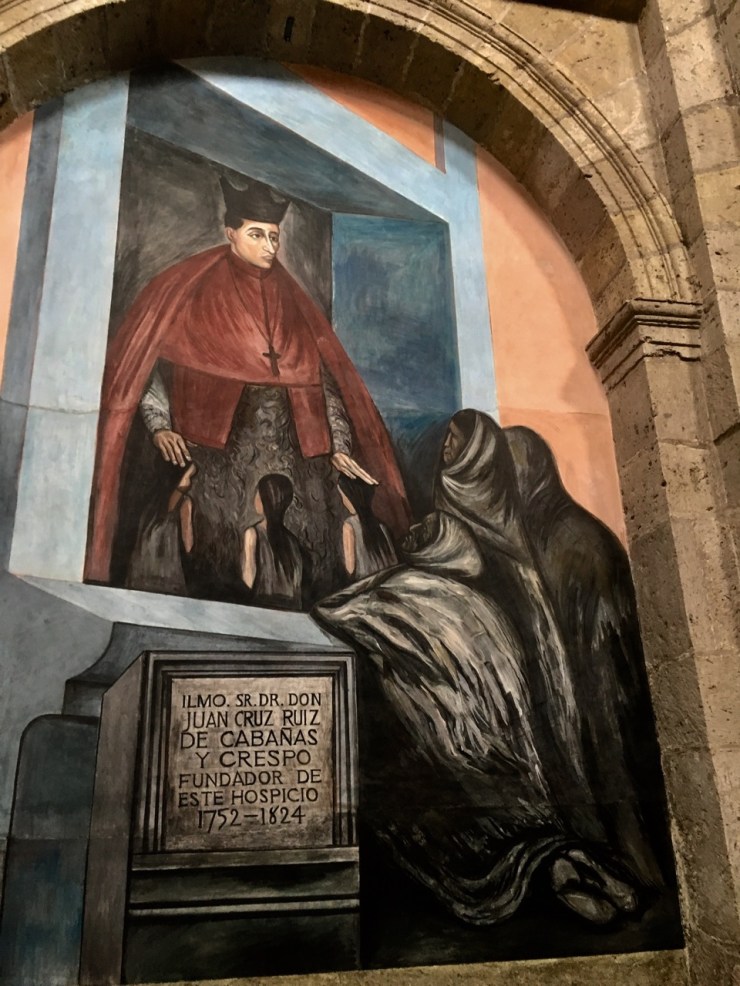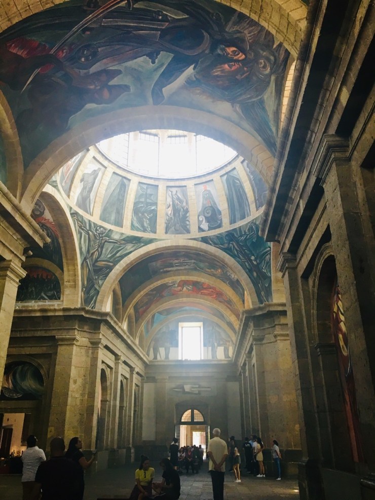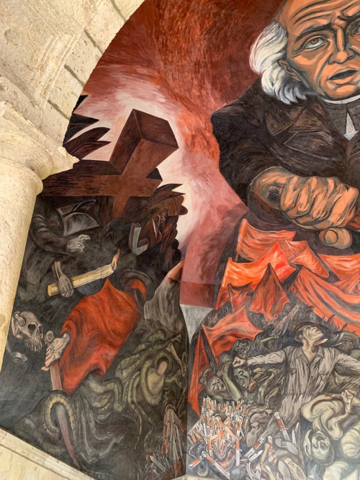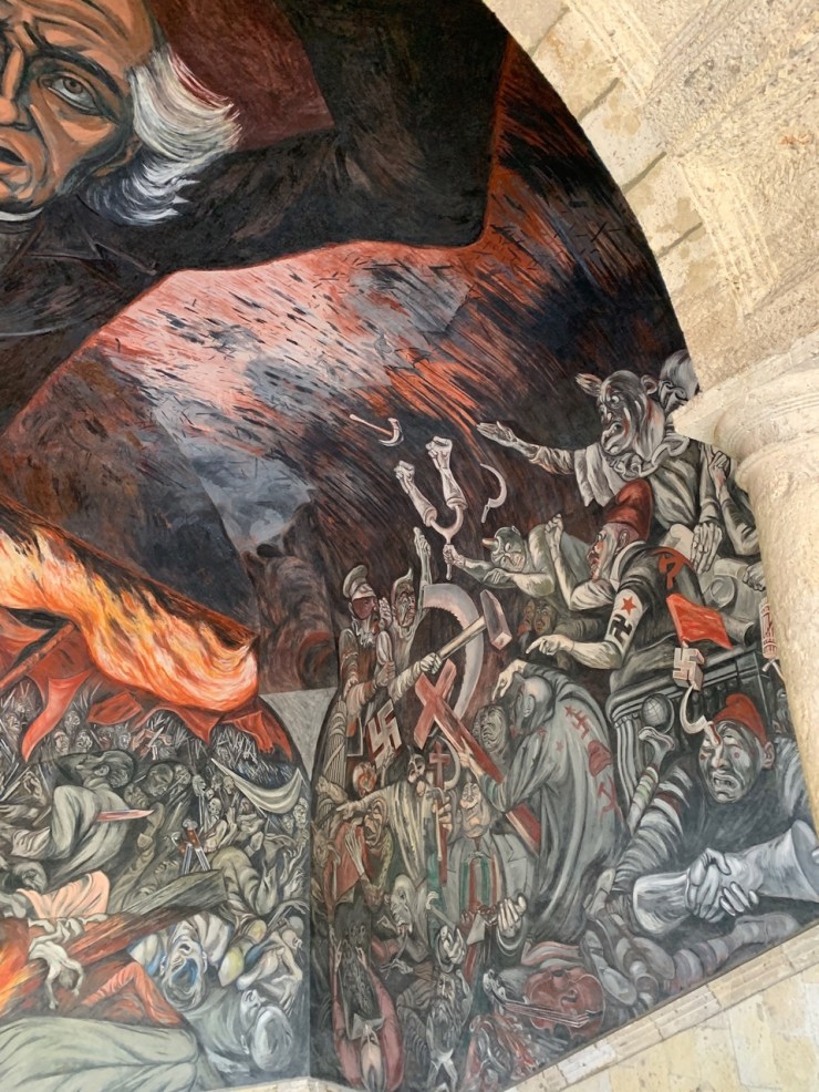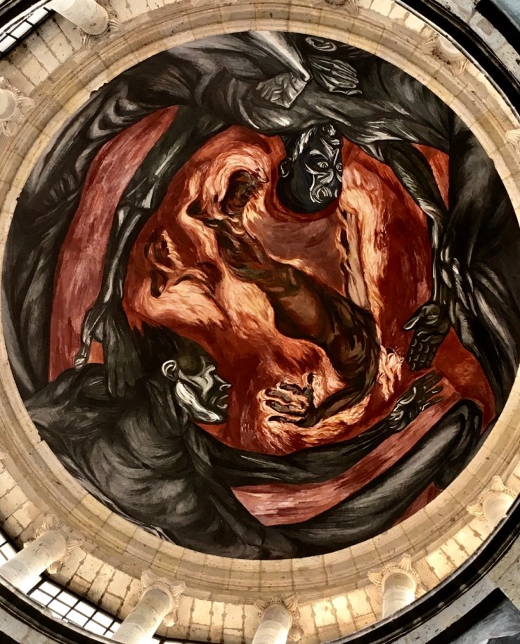 Instituto Cultural Cabañas. Designated a UNESCO World Heritage Site. a hospital and orphanage from 1810 into the 1900’s. Unique for its time and one of the largest hospital complexes in America. In the 1930’s, 57 macabre murals were added by José Clemente Orozco on the walls and ceilings, showing anger at social injustice through history. The most famous is El Hombre del Fuego (The Man of Fire) in the dome.