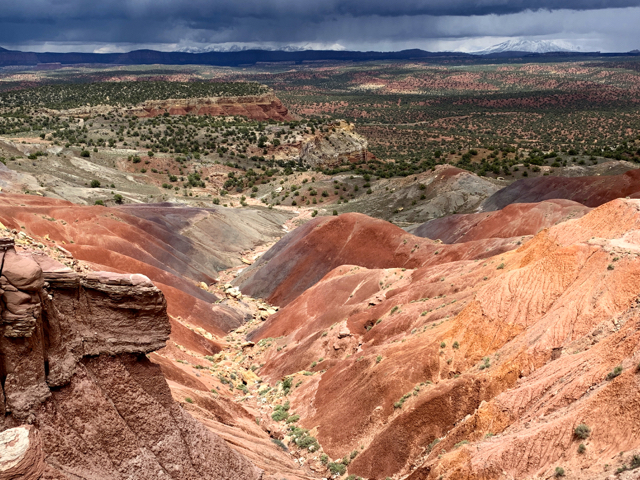 The first 17 (paved) miles on this backroad wound around/up/down and through the deep Long Canyon, topping out with views of Grand Staircase and the Waterpocket Fold. Then the road became dirt and impassable and we turned back.