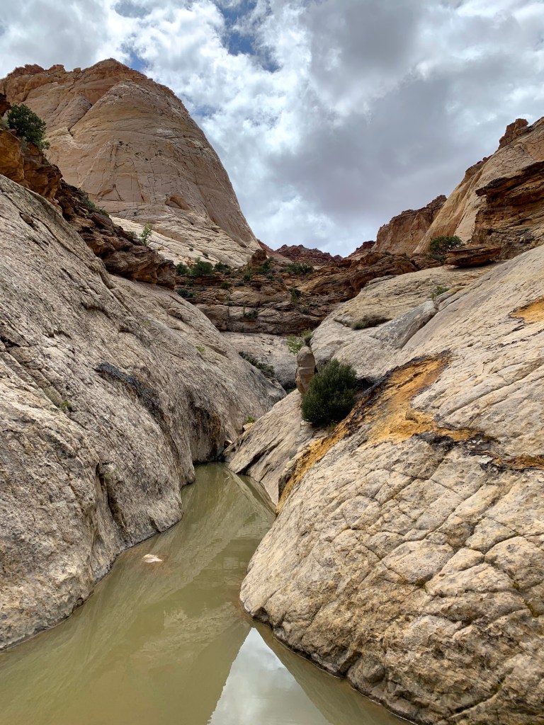 Grand Wash is a canyon that cuts through the reef. The wash is a channel path that follows the riverbed, typically dry except when we were there. I hiked until I saw mud at the start of the narrows. They say Butch Cassidy (and The Hole in the Wall Gang) hid out here in the 1890s.