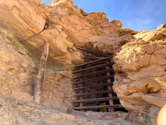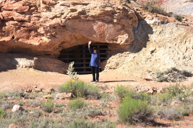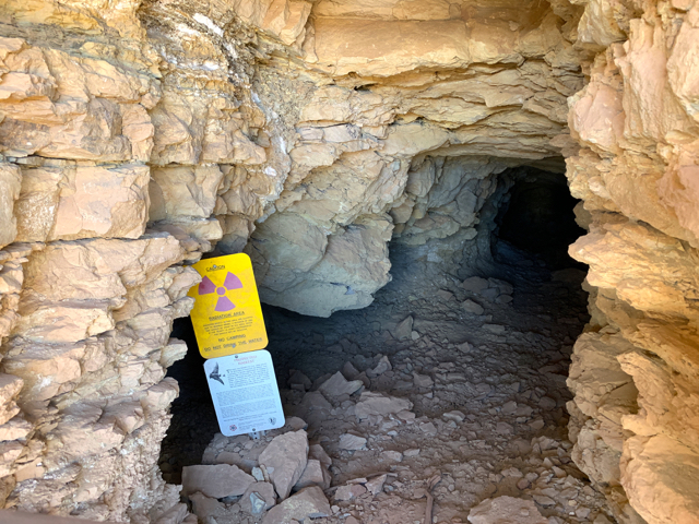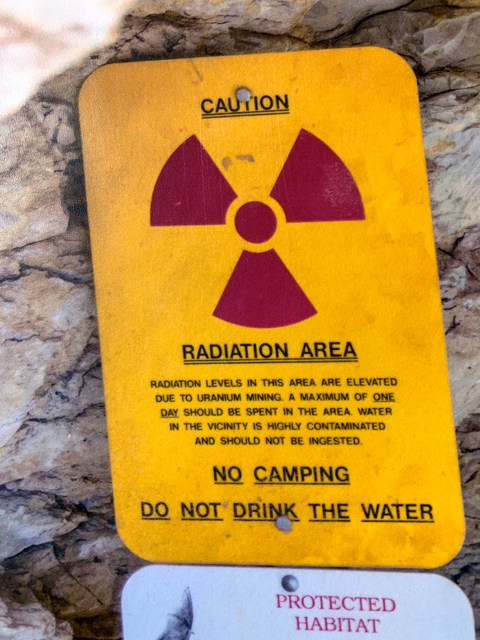 Radioactive! “Elevated radiation levels due to uranium mines. A maximum of one day should be spent in the area. The area water is highly contaminated.” So of course I checked it out while Steve stayed a safe distance away. The shaft is a protected bat habitat (protected from people).