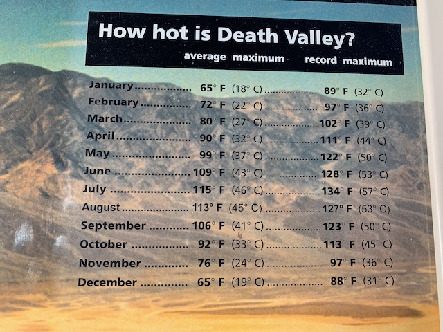 Death Valley – hottest of the hot and lowest of the lows. If you’ve been there, you know. If not….go! The colors, salt flats, dunes and badlands blow your mind. How hot? We were there in November….very pleasant.