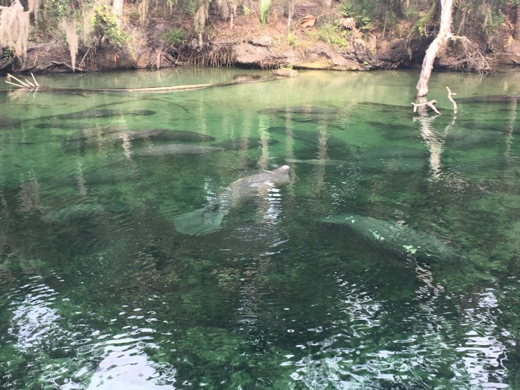 The manatees are year-round residents in the river and lagoon, but when chilly weather sets in, they congregate in warm springs near Orange City, Florida, not far from Orlando