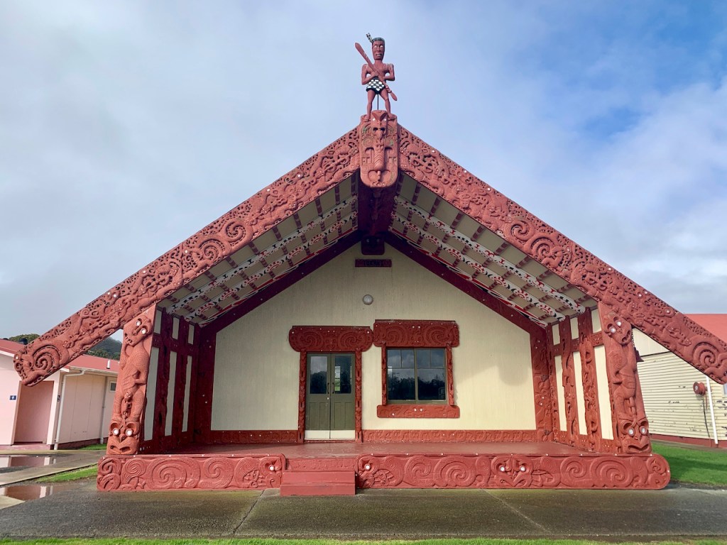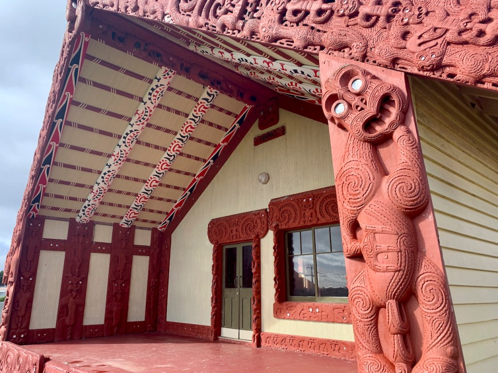 At the entrance is a pou whenua (carved post marker) used by Māori to mark places of significance. Elaborately carved pou are found throughout NZ.