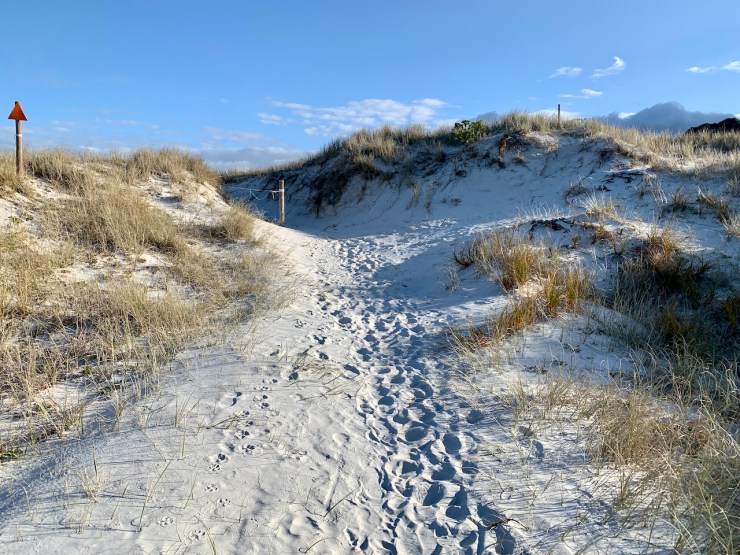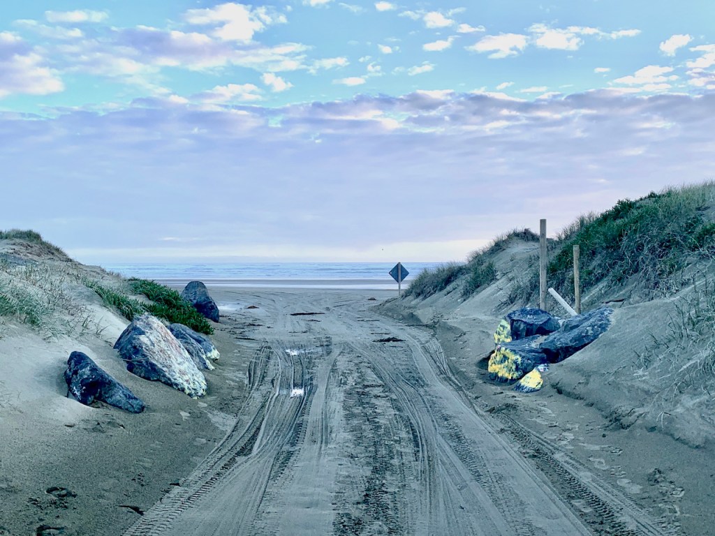 Near the road’s end, a view to sand dunes, the spit, and the sea. The lighthouse awaits.