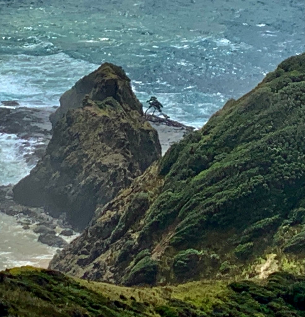 Below the lighthouse on a rocky point survives a lone weather-beaten 800 year-old pōhutukawa tree (barely visible in the first photo). The tree is the jumping point for the spirits departing Aotearoa (NZ), descending to the watery underworld (reinga), and ultimately their spiritual ancestral home.