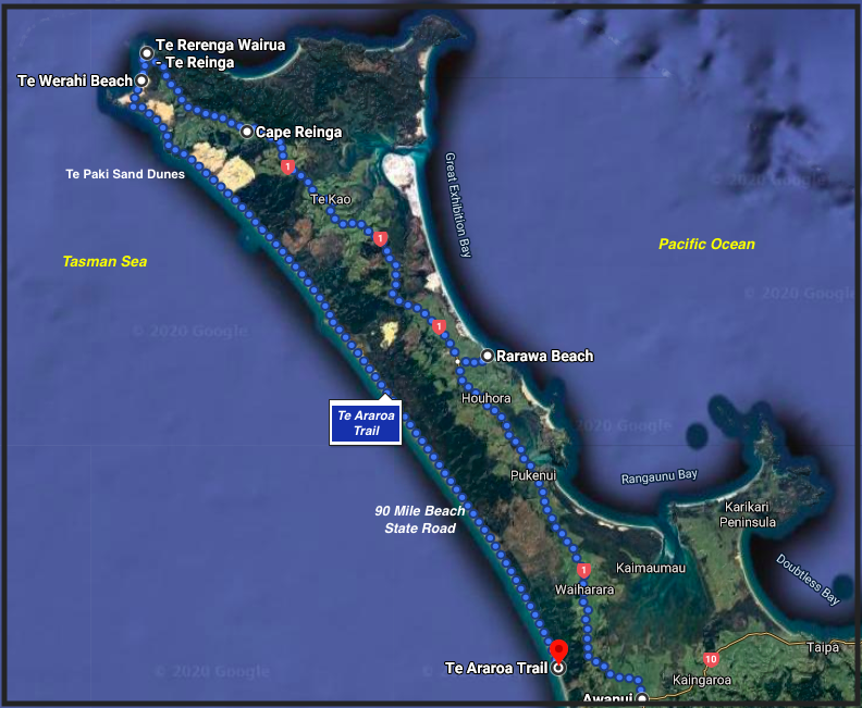Te Werahi is the terminus of the famous Te Araroa Track “The Long Path”. Te Araroa is a 3000 km (1864 mi) track from Bluff, South Island to Cape Reinga, North Island. It takes 4 to 6 months to tramp end-to-end. Some stretches are rough and undeveloped; I reckon it’s a challenge.