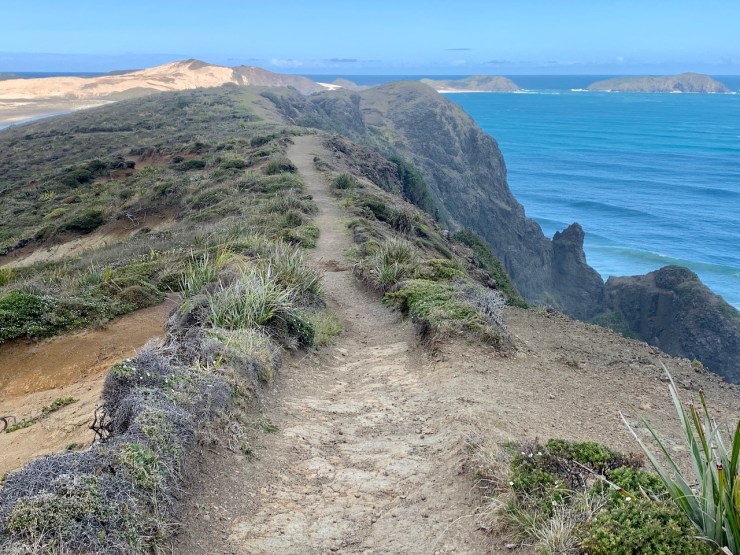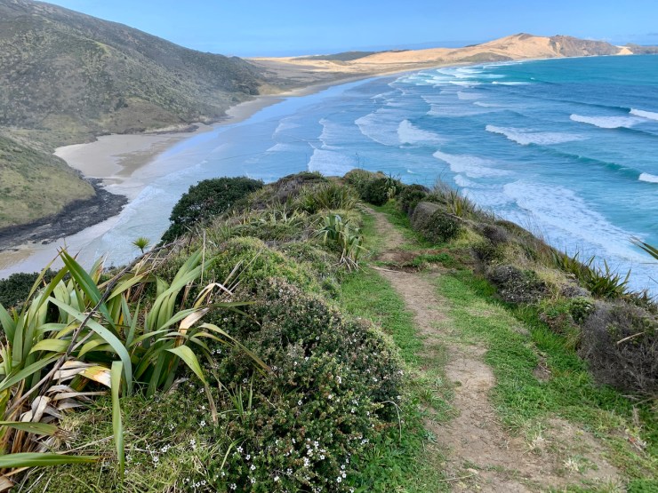 Below the lighthouse is Te Werahi Trail, a 2 km track down past steep cliffs to sweeping Te Werahi Beach, with tremendous views worth the short hike.