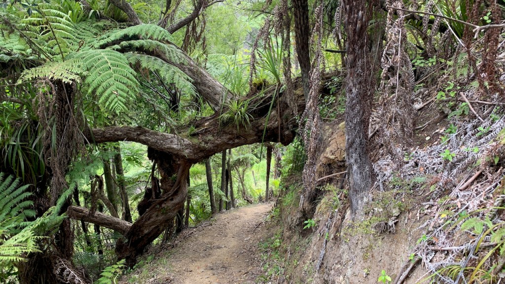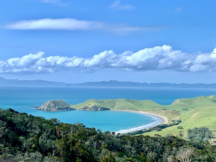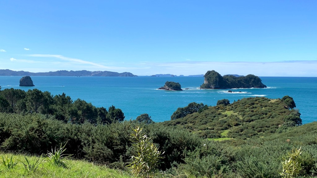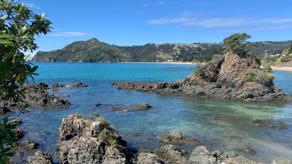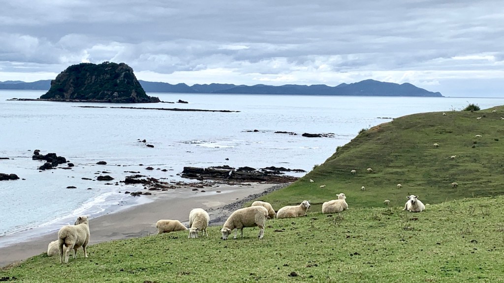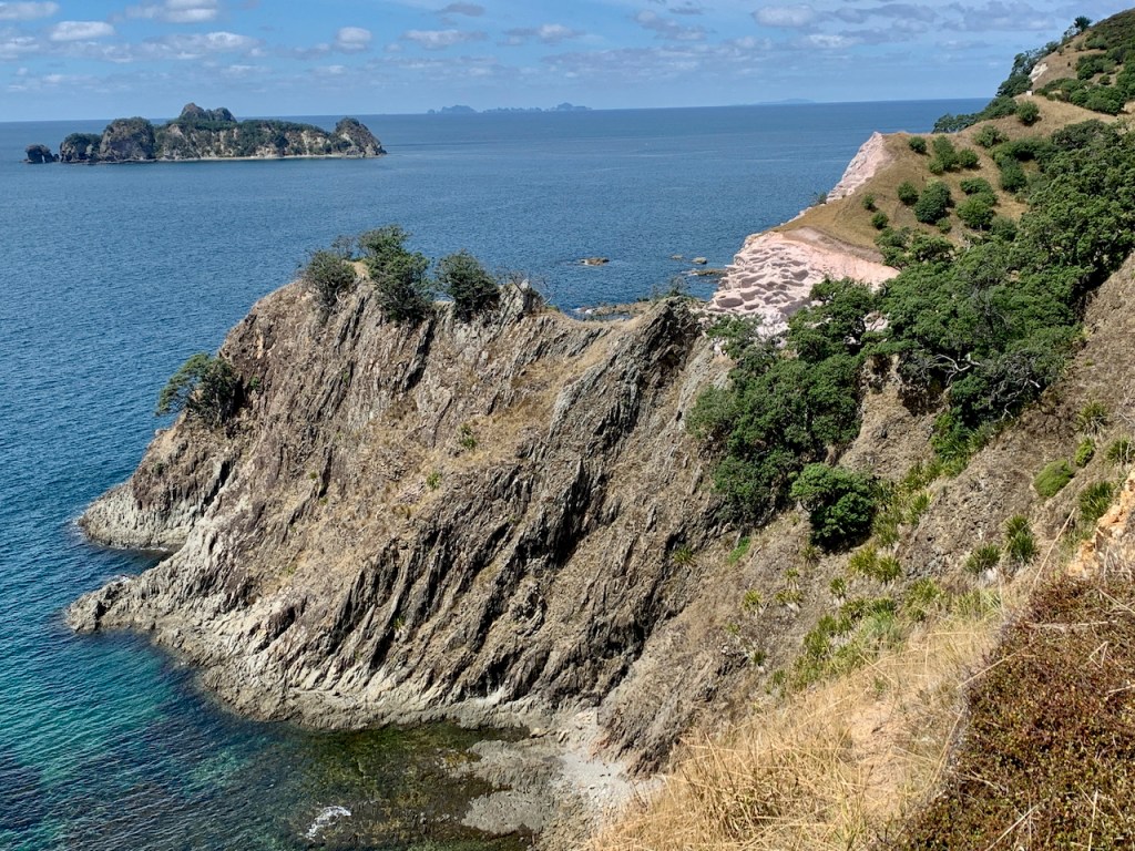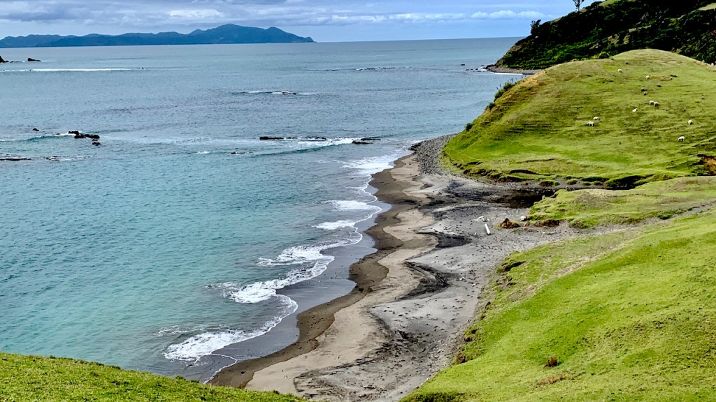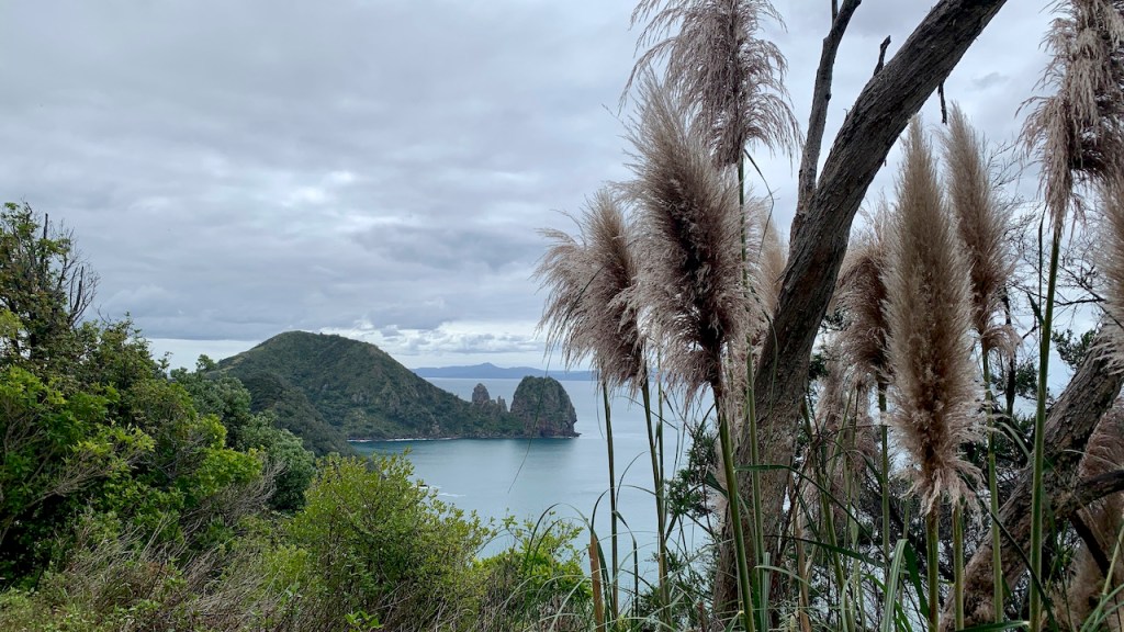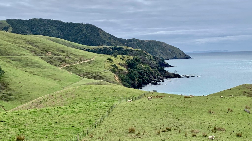 The Coastal Walkway is mostly gentle, with a few steep sections, across a sheep station, through forest and dense bush. The payoff – rocky coastline views all the way to NZ Great Barrier Island.