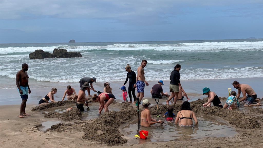 Dig a hole on the beach for a soak as HOT water, 64°C (147°F) filters up from underground. The beach is long and wide but the magic hot spot is in a very narrow space – at LOW TIDE.