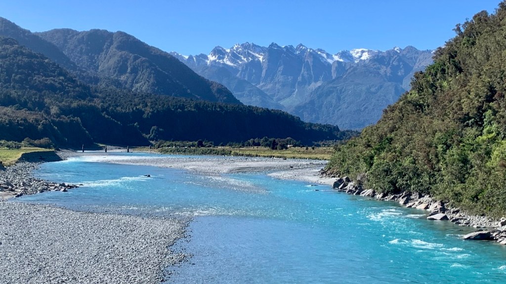 Fox Glacier lies in a steep valley and floods often wash away the trails. The Fox Glacier Valley Walkway is a 2.5 hr. walk (return) through a majestic rainforest to various distant viewpoints. It’s a beauty of a trail (for both feet and bikes.)