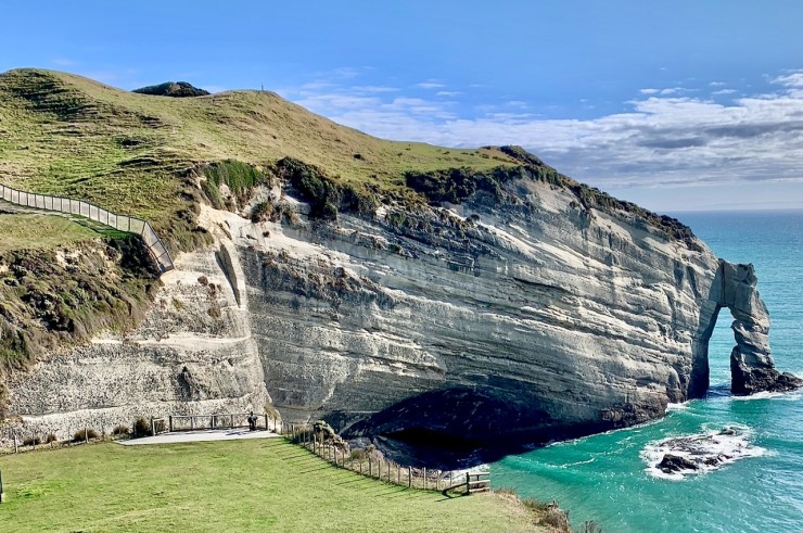 Māori spirits bid farewell to their earthly connection here. One slip and so will you. The quartz sandstone archway is carved into cliffs dropping into a not-so-calm Tasman Sea. A clearly marked trail is between here and Pillar Point (and beyond).