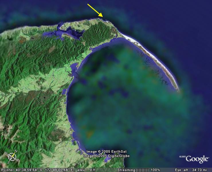 Cape Farewell – The most northerly point of South Island. On the map (slightly rotated) it resembles a spot on the top of a kiwi’s head. Named in 1700 by Captain James Cook to mark his last glimpse of NZ as he sailed away.