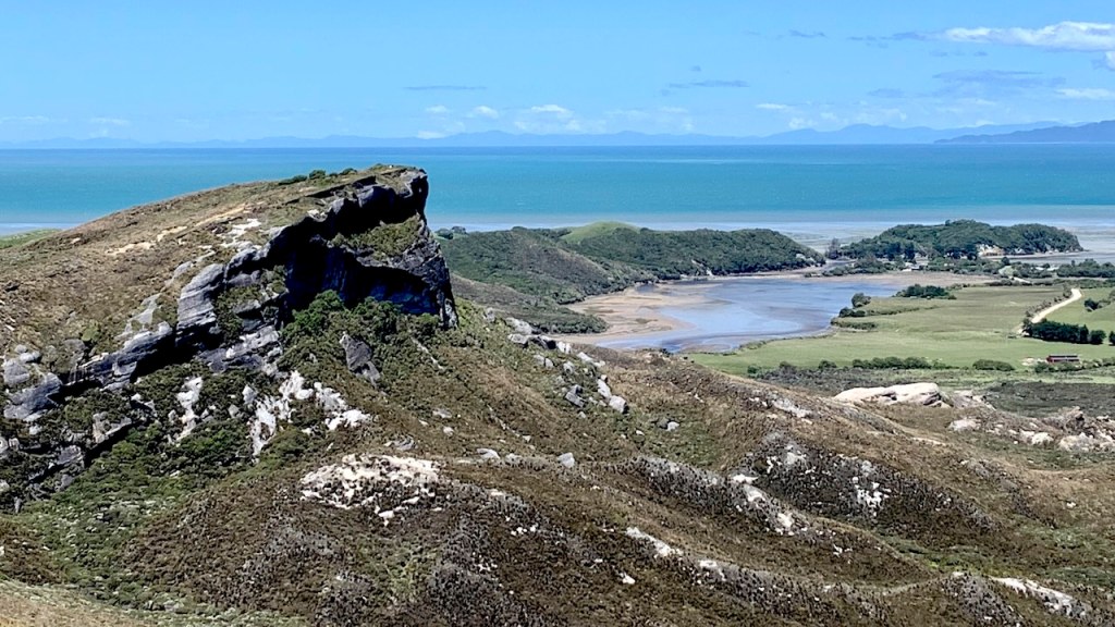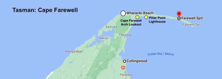 Nearby is an easy hike with beautiful views of Farewell Spit. The howling winds made the sand storm on the spit visible from the point. Walk from here to the Cape Farewell Arch.