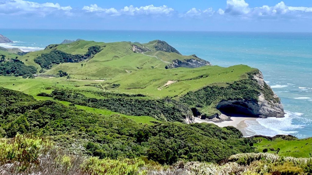 A 2.8 mile out and back trail to remote Wharariki Beach. A beauty of a track through farm pasture and coastal forest onto a beach that the Māori called Onetahua – “heaped up sand”