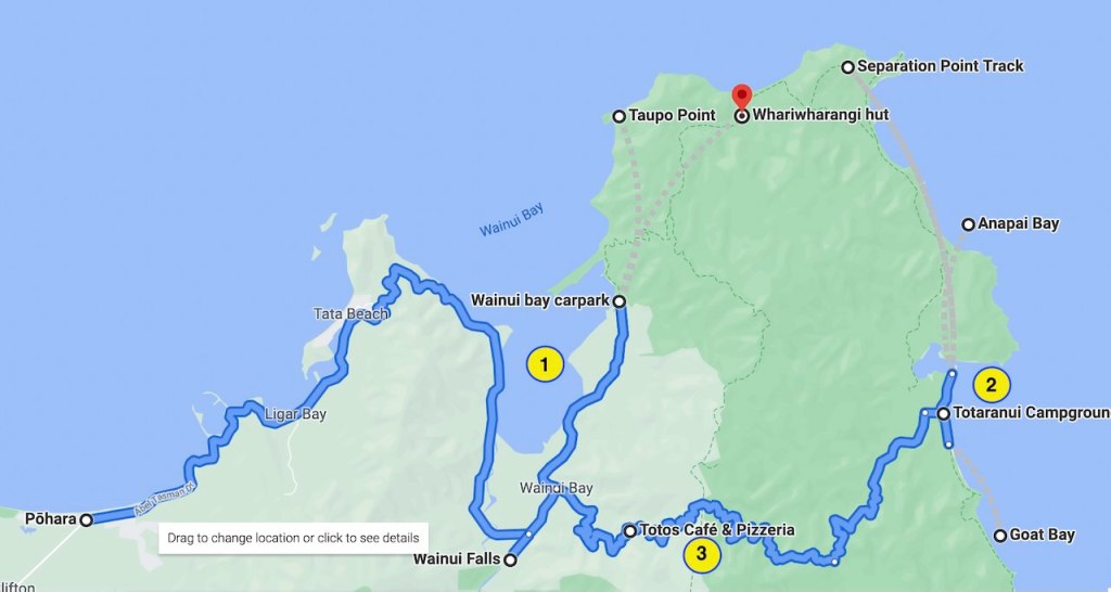 This post is about the park’s remote north (fewer visitors): 1) Wainui; 2) Tōtaranui, the northern access point; 3) and a surprise pizzeria in the bush between them.