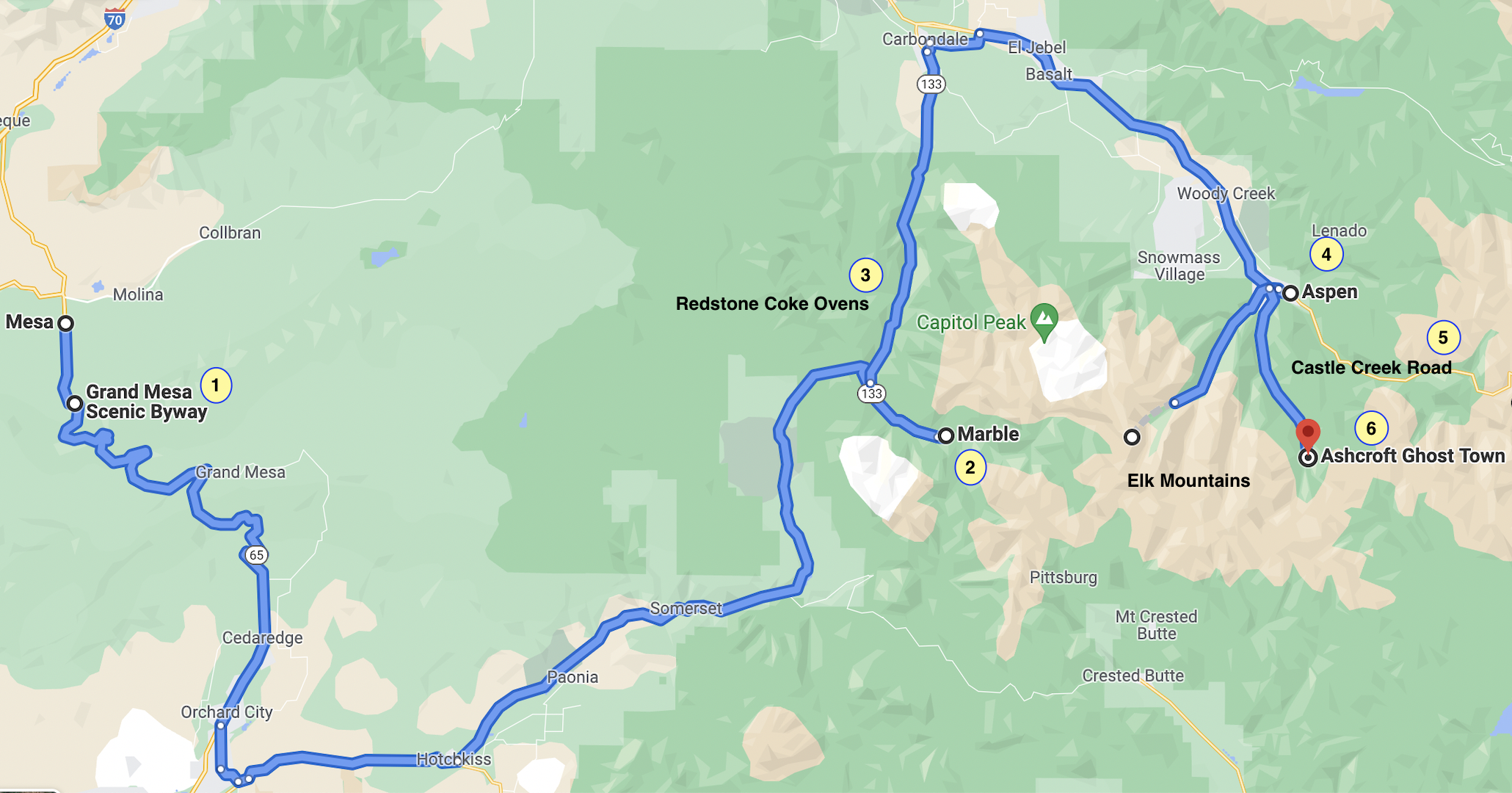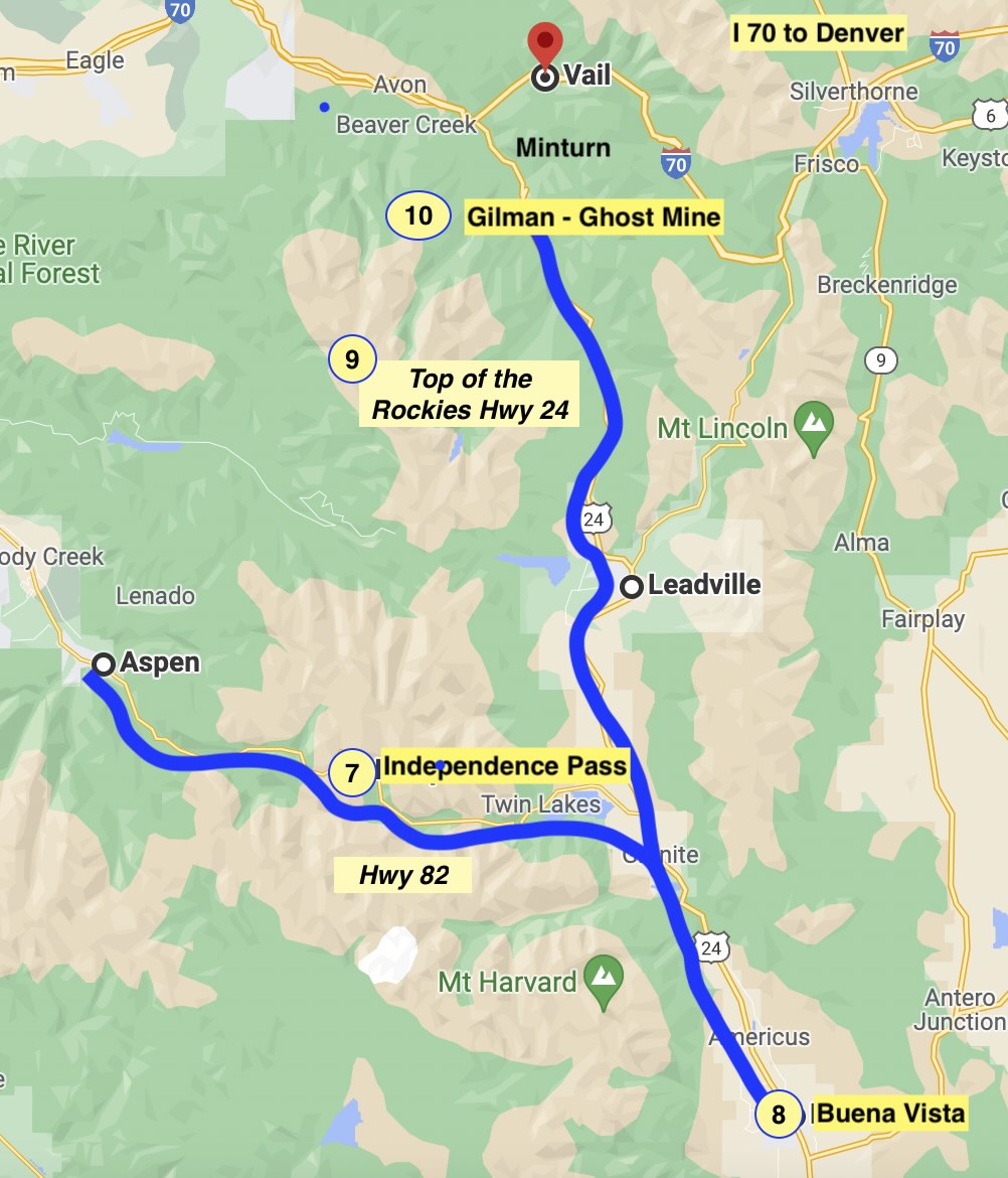(2) Marble Mining Trail (3) Redstone (4) Aspen | (6) Ashcroft Ghost Town | (8) Buena Vista | BV to Leadville, Minturn, (10) Gilman’s Ghost Mining Camp |
