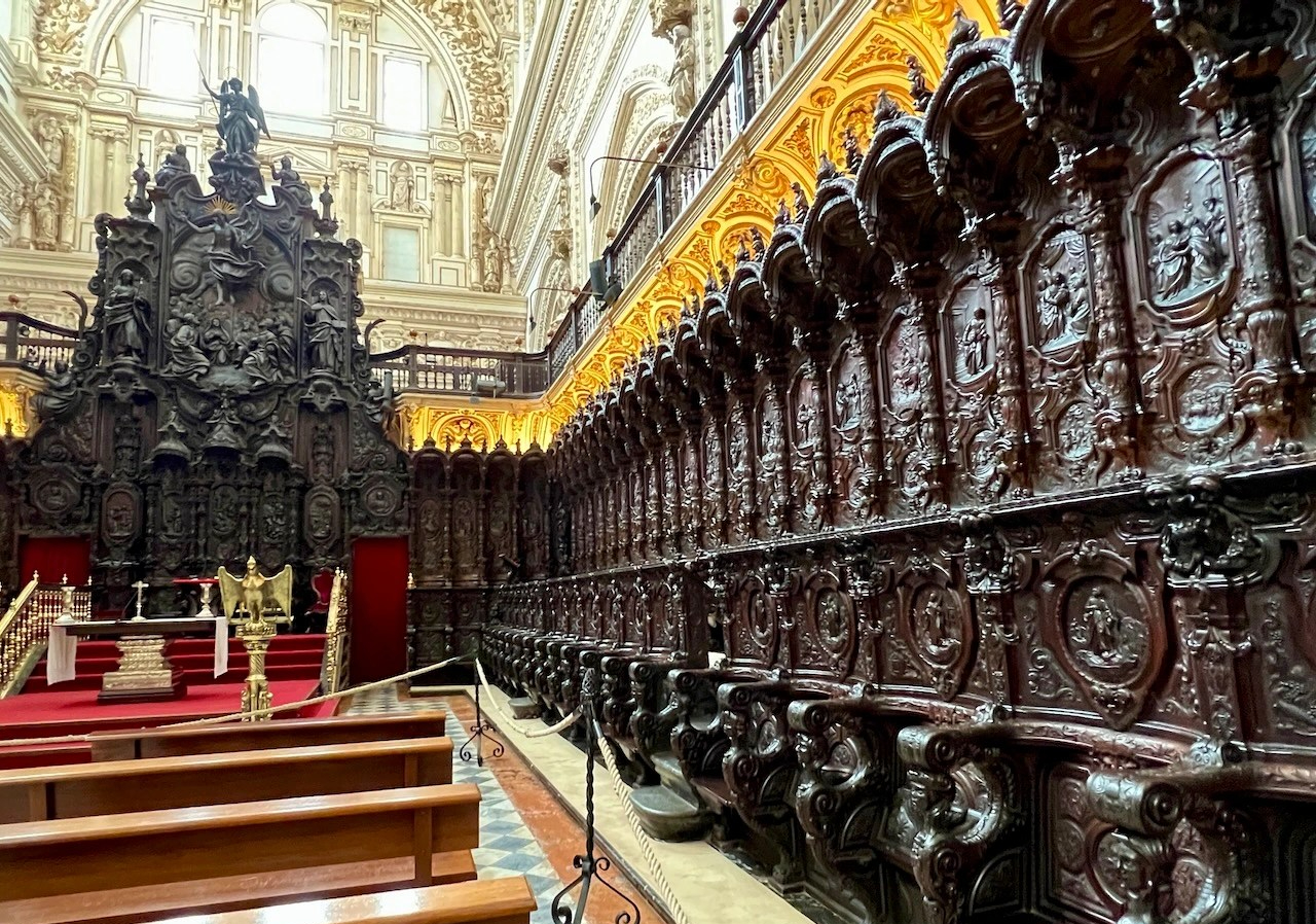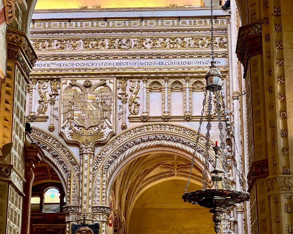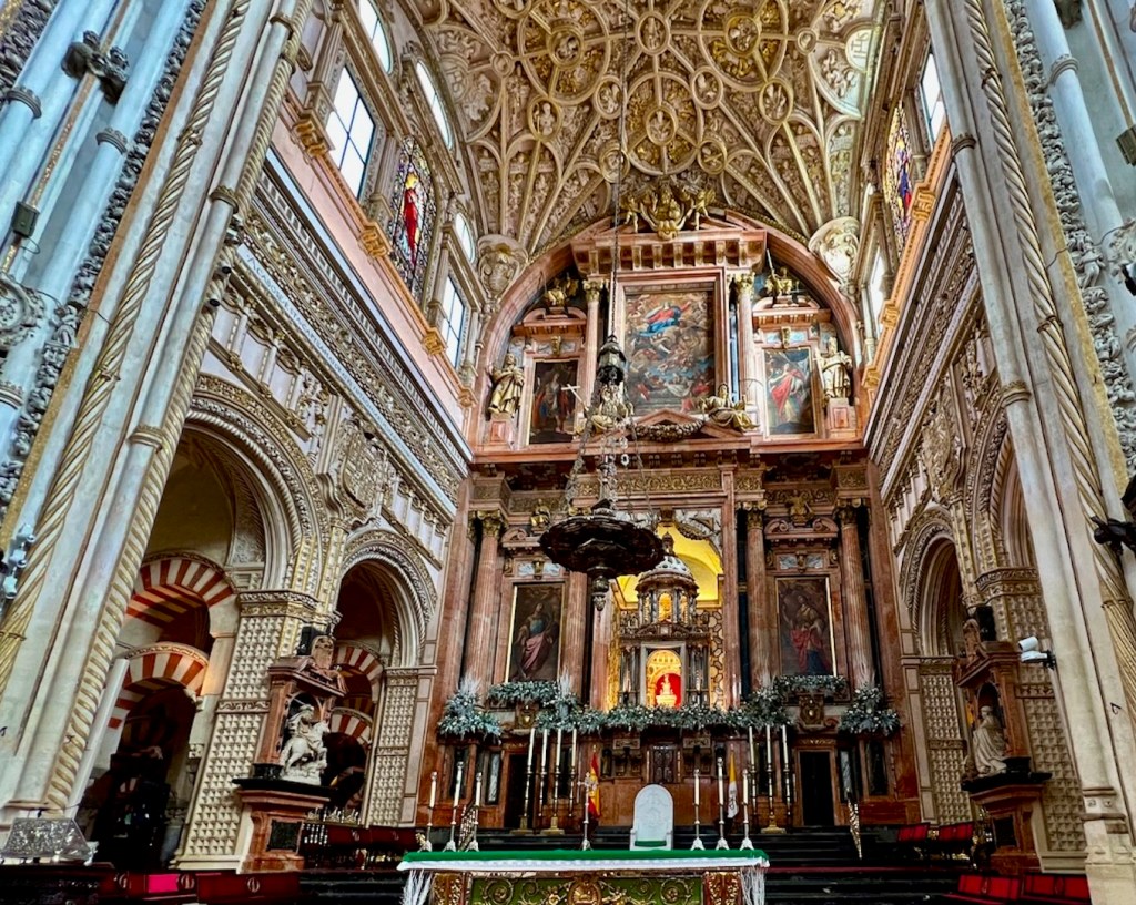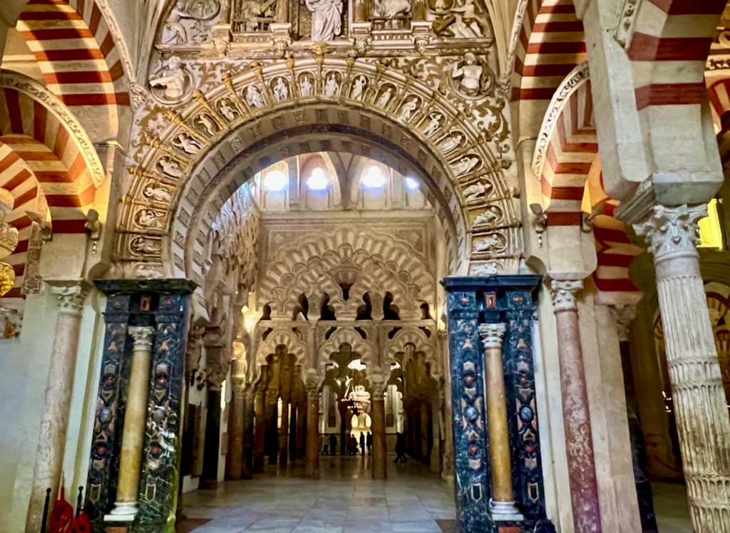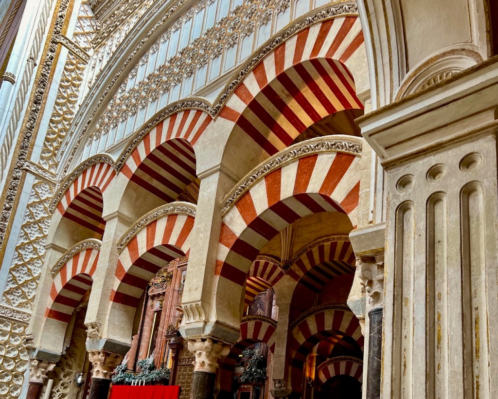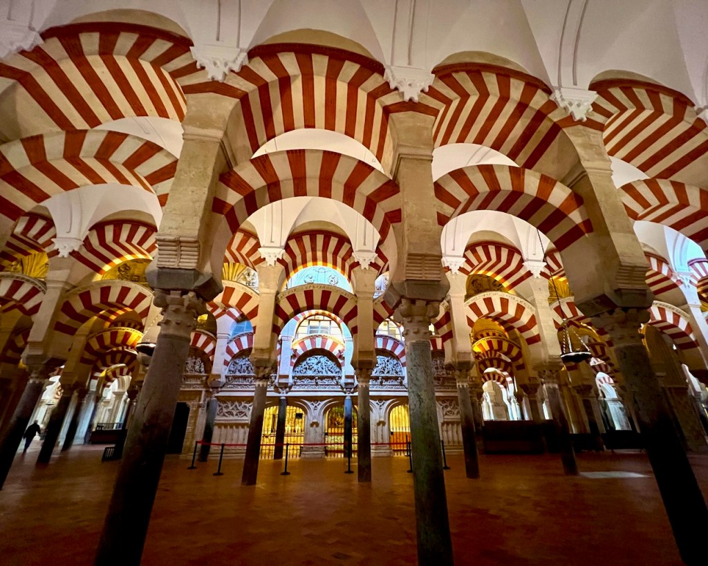 In 1236 Córdoba was conquered by King Ferdinand III of Castile and the mosque repurposed as a Catholic cathedral, preserving the expanse of this wonder of western Islamic architecture. (856 striped columns – 1293, before the cathedral arrived.)