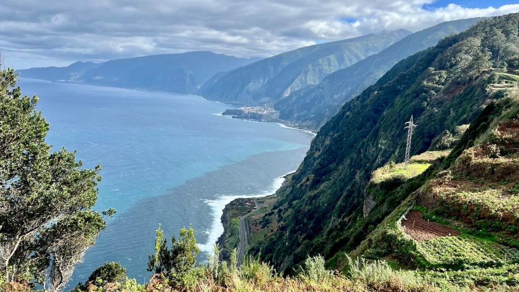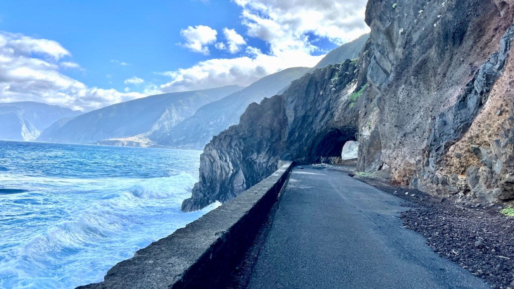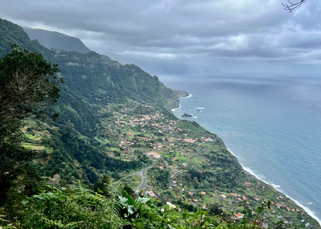 Madeira roads: The VE (Express) or VR (Via Rápida) are direct routes using endless tunnels. ER roads serpentine over mountain and valley, but you see so much more – like this vista over Arco São Jorge, typical of the many seaside villages.