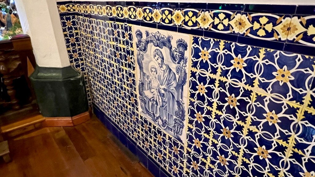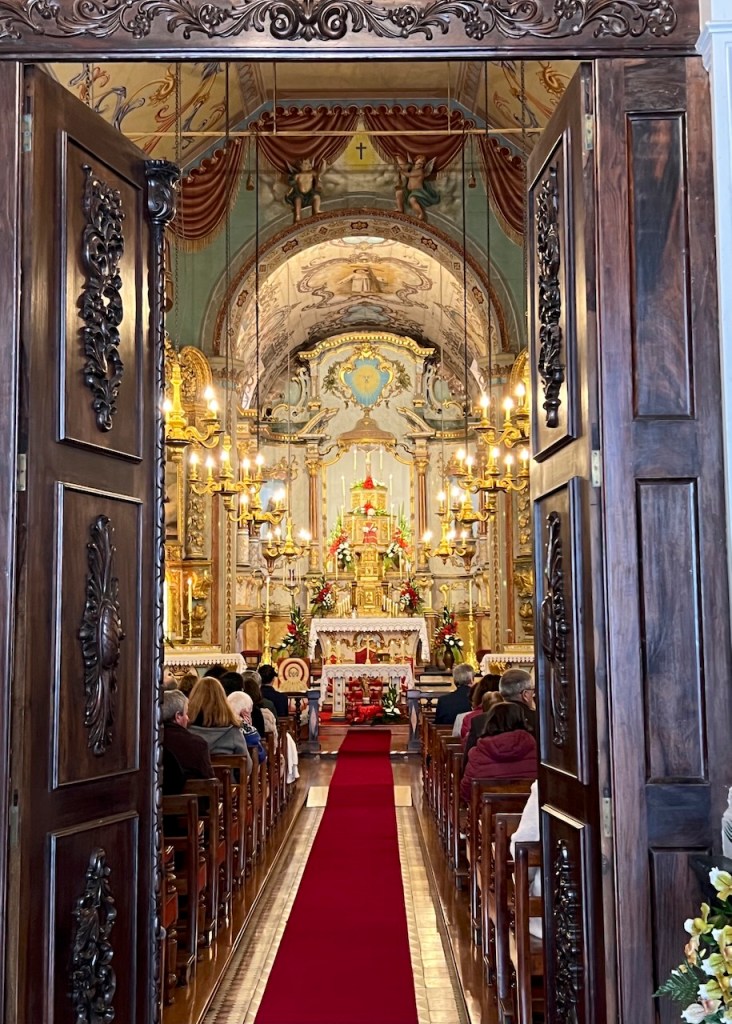 The 17th century São Vicente Parish Church has a stunning baroque ceiling, blue azulejos (tiles), and an 18th century pipe organ.