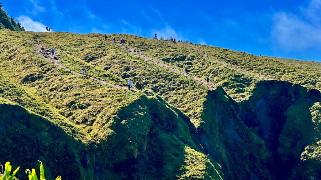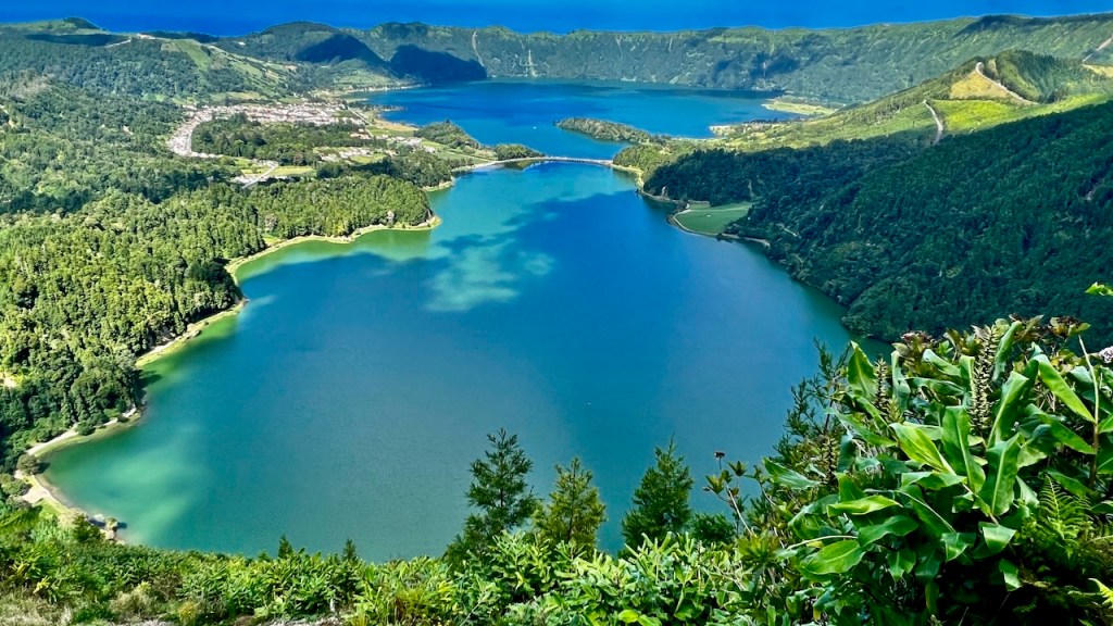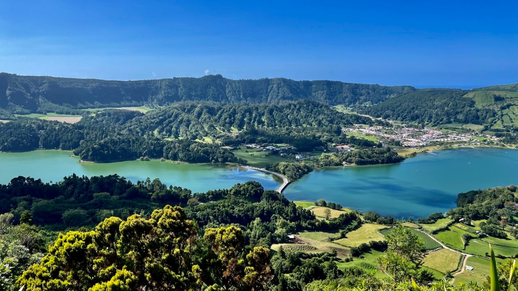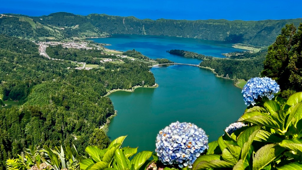 A bridge separating the two lagoons is bordered by pink surprise lilies and ubiquitous blue hydrangeas (past their prime in September). Inside a crater is the village from which you can rent kayaks or bikes to circle the lake.