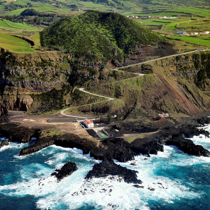 Ponta da Ferraria is a regional national monument, the landscape shaped by ancient volcanic activity. Pico das Camarinhas, 300 meters above Ponta da Ferraria, generated the lava fajã (lava flow).