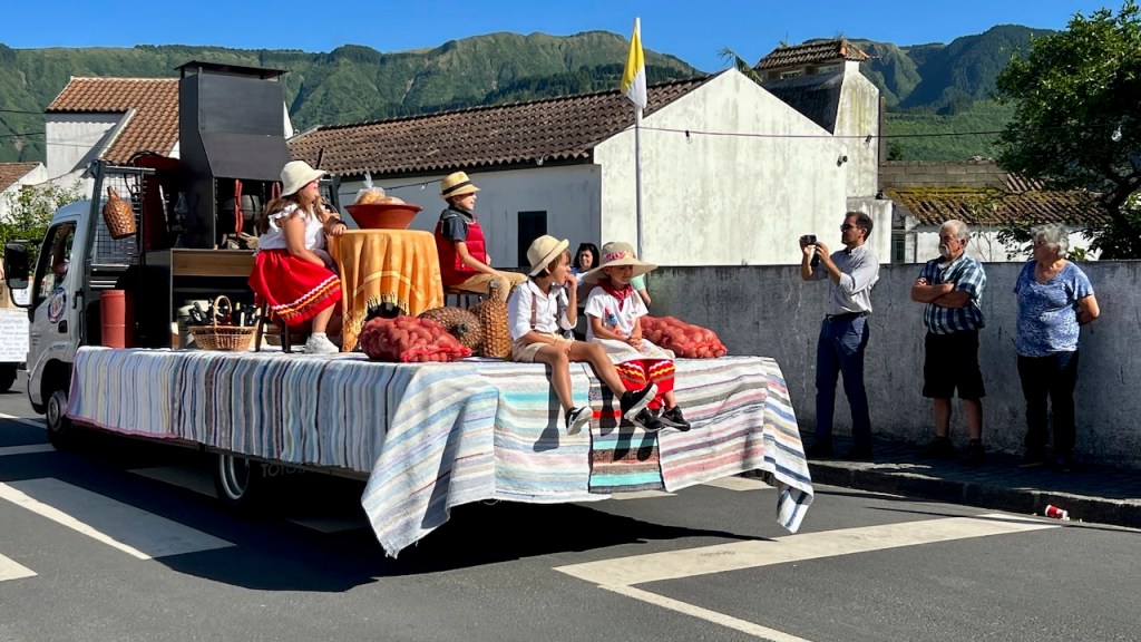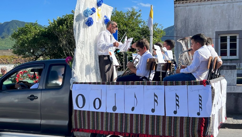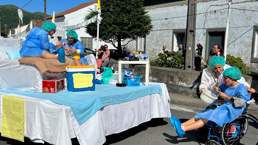 As we entered town, a parade was forming. A half dozen floats rolled by, led by an accordion band and a pair of oxen. Stealing the show was the Health Center float as rowdy patients sipped wine from IV bottles and stashed SuperBock beer under hospital beds.